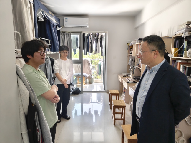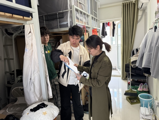 走访中,吕荣冠一行逐一检查各间宿舍,详细询问日常作息、学习状态和生活需求,倾听学生困惑与建议。围绕宿舍卫生、用电安全、防火防盗和学风建设等方面,叮嘱同学们养成良好卫生习惯,提高防护意识,共同营造文明居住环境。并鼓励同学们积极参与各类活动,营造勤学笃行的宿舍学风。